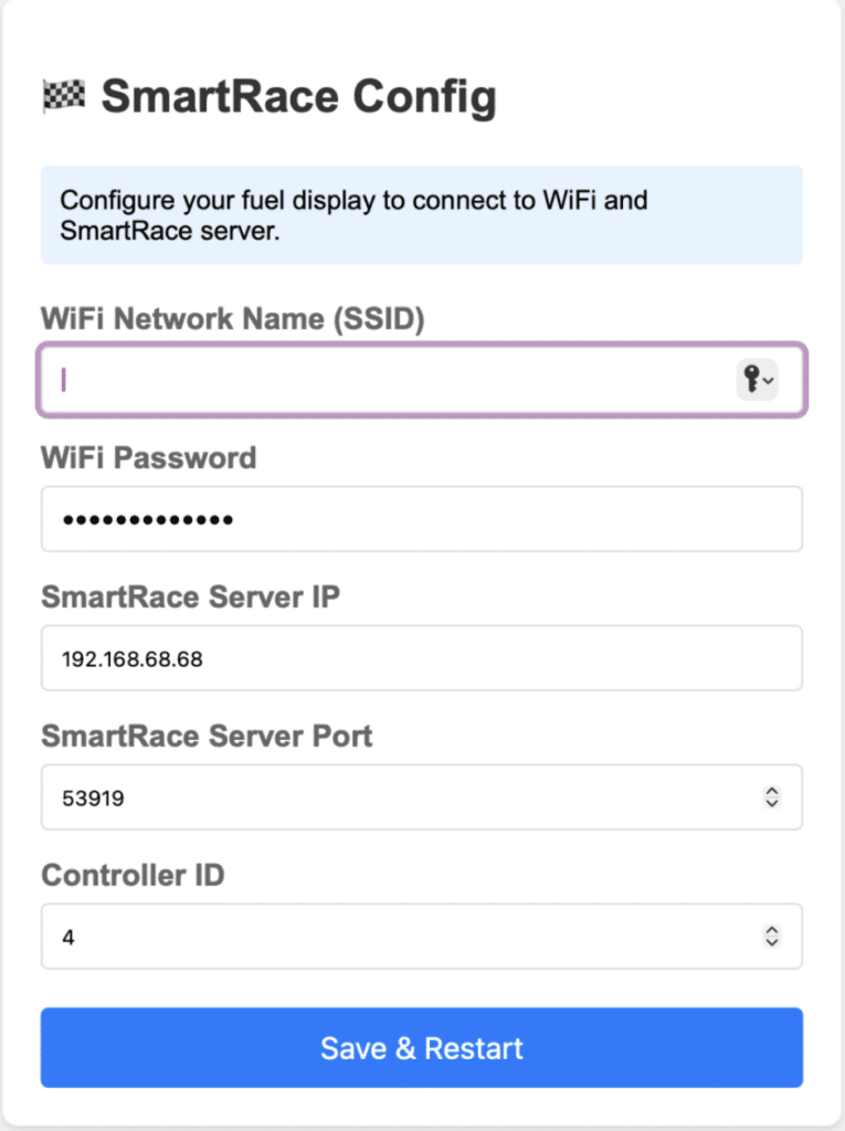 When I wrote the code to run it all, I learned much about Web Sockets (thank you for the extra help Marc!) as well as writing code for these tiny ESP32 based devices. It’s been really fun to explore the possibilities. I am amazed at what it can do like the wifi AP and server for set up. Once you save the set up, the device reboots and connects to your WiFi, and then your SmartRace server (messages display the progress on the screen). Once done, it switches to display the fuel level of the selected controller and is ready for action. If anyone is interested in the code, I’ll publish it on Github. Contact me at scottmcglynn on the SmartRace Discord server if you have any questions.