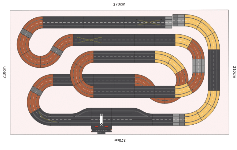 This proposal to build a carrera slot racing track was submitted by the author "Volker K.". The track has a width of 370 centimetres and a depth of 210 centimetres and was created with the tool Softyroyal Bahnplaner.