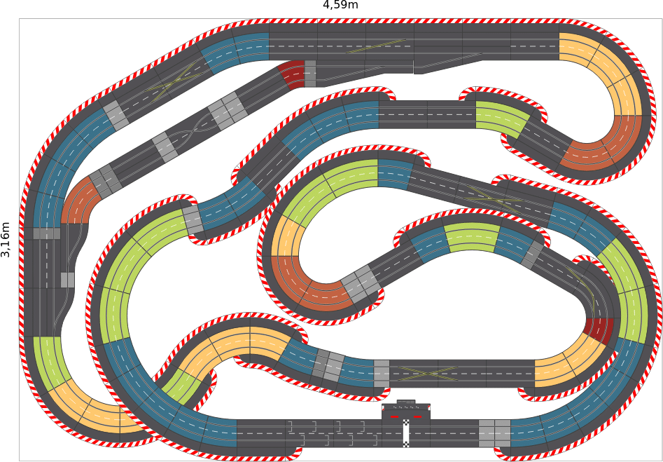 This proposal to build a carrera slot racing track was submitted by the author "Martin D.". The track has a width of 459 centimetres and a depth of 316 centimetres and was created with the tool Softyroyal Bahnplaner.