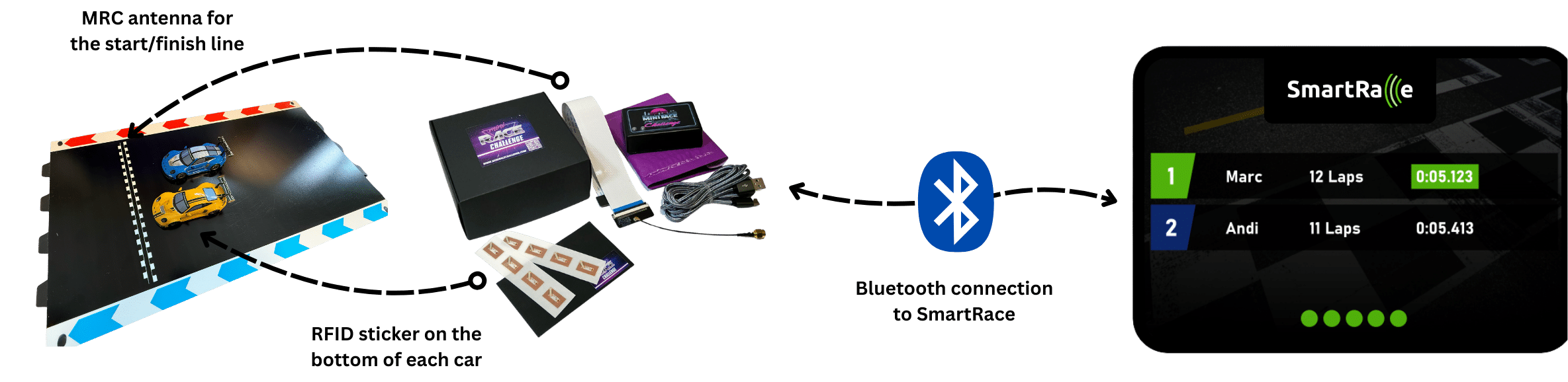 The Mini Race Challenge timing system is the perfect tool for timing on racetracks and racing cars from a scale of 1:76 upwards. With an RFID sticker that is simply attached to the vehicle and requires no power supply, and an antenna that is placed under the track, lap times can be recorded for any number of vehicles.