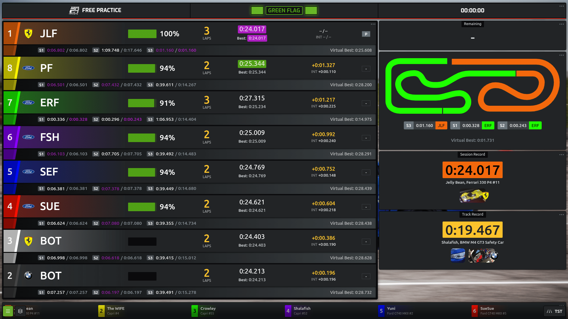 Suitable for up to 6 driver, 1 bot car and 1 safety car. Layout includes remaining laps, best sector times, and best laptimes (current session and track record. Best at 1920x1080.