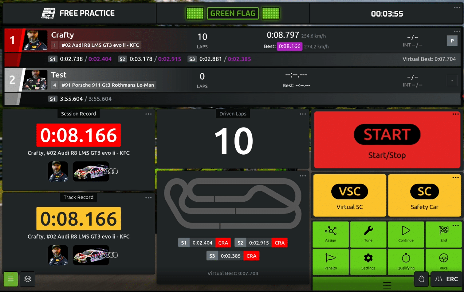 This is a race screen designed by Slot CraftMaster and is made for clear information and quick access to all necessary buttons and factions. To get more info on how to set up the track layout, drivers and cars images, visit the Slot CraftMaster channel on YouTube.